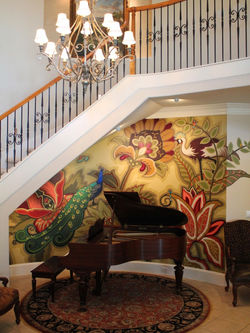 Художественная роспись холла и лестничного проема. Декорирование интерьера росписью актуальное и популярное оформление стен и потолка. Художественная роспись холла очень занятная задача, она чем-то перекликается с росписью гостиной. Но если гостиная - лицо дома, то холл - место отдыха и прогулок.Украсить стены холла можно спокойной классической живописью или простым декоративным решением.Художественная росписи холла являются областью монументально-декоративного искусства, они находят широкое применение в оформлении интерьеров, позволяя создавать живописные композиции, органически связанные с архитектурой дома: расписывать потолки, стены, арки, иначе говоря, любое пространство, согласно единому замыслу. В художественной росписи имеется масса положительных сторон. Монументальная роспись создаст оригинальность и неповторимый декор Вашему интерьеру. Роспись выполняется на отштукатуренной поверхности профессиональными художественными материалами. Благодаря нашему многолетний опытом, диплом художественной академии Вы будете владельцем подлинного произведения искусства. Объемная роспись визуально может расширить границы Вашего холла или лестничного проема, и современные экологические материалы прослужат долгое время.